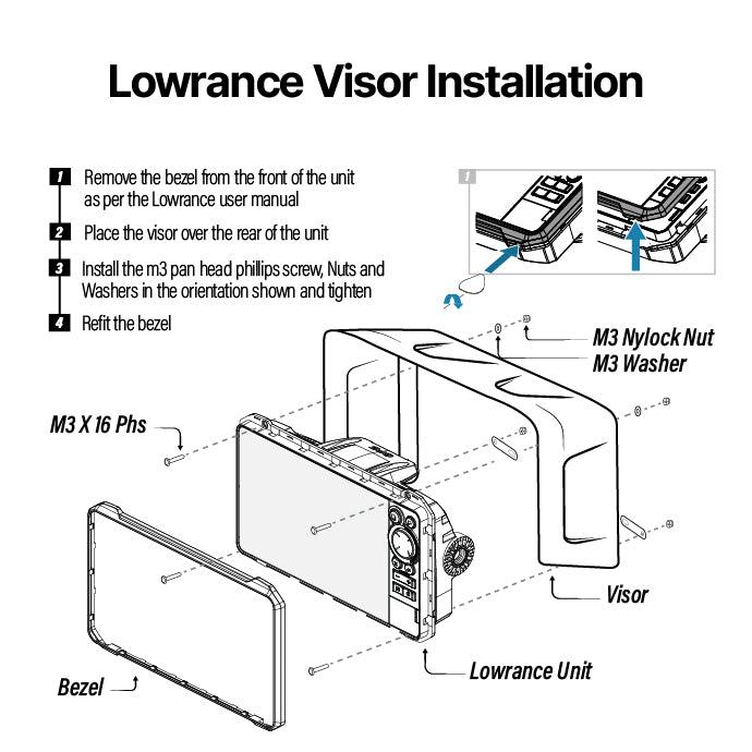 Our Lowrance Visors are the only shade specifically designed to fit your individual Fishfinder / Chartplotter model. They are lightweight, strong, sturdy, and super easy to install on your unit.